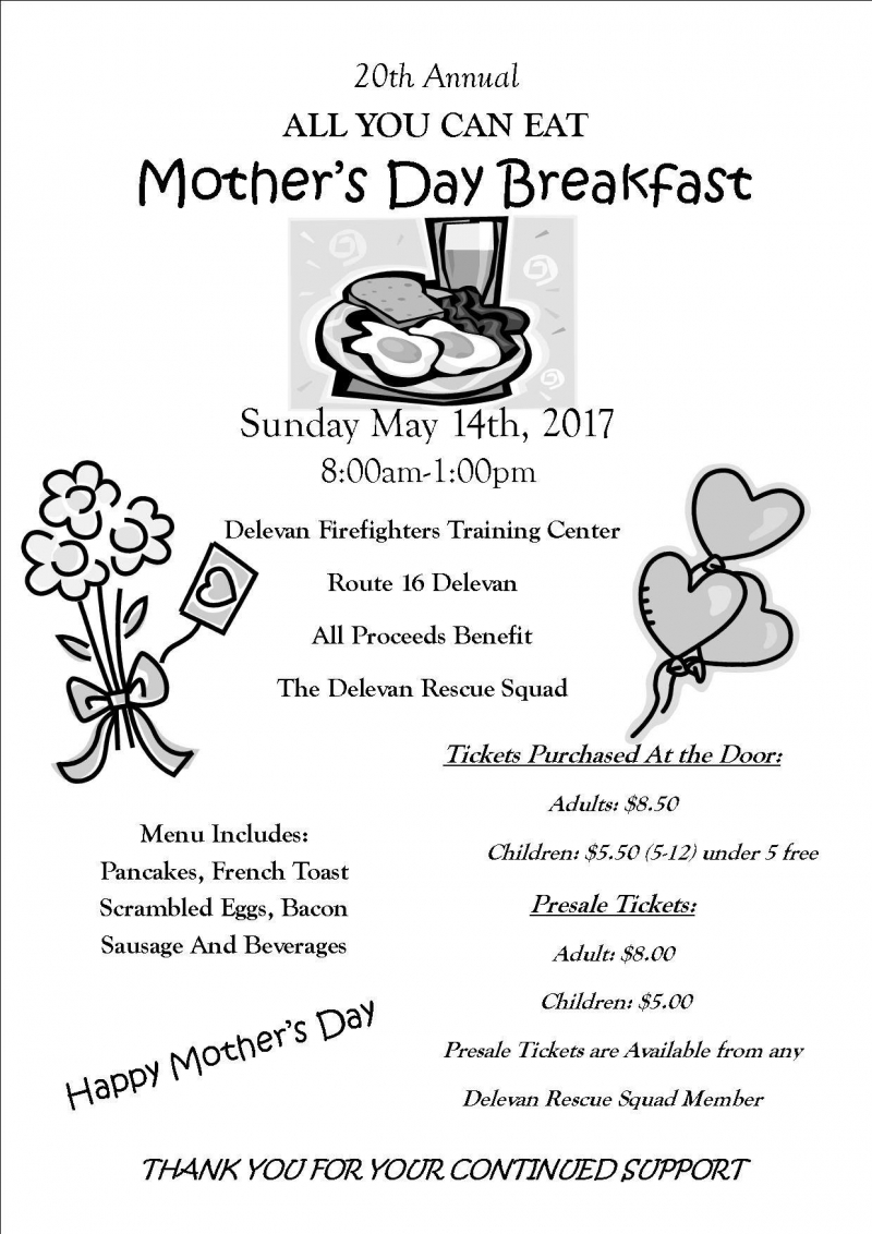 The 20th Annual All-You-Can-Eat Breakfast for Mother's Day is on Sunday, May 14th, 2017 from 8:00am -1:00pm at the Delevan Firefighters Training Center, Route 16, Delevan, NY.