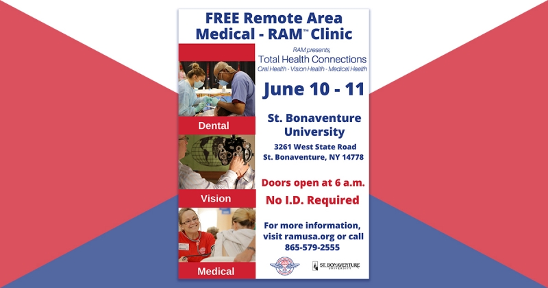 There will be a FREE Remote Area Medical - RAM(tm) Clinic offering Dental, Vision and Medical services on June 10 and June 11 from 6:00AM until 2:00PM** at St. Bonaventure University.