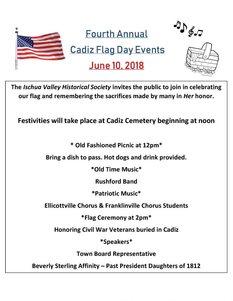 The Ischua Valley Historical Society will host The Fourth Annual Cadiz Flag Day event on Sunday, June 10th at the Cadiz Cemetery. The Ischua Valley Historical Society invites the public to join in celebrating our flag and remembering the sacrifices made by many in Her honor. The public is invited to share in the festivities that will begin with a community picnic at noon.